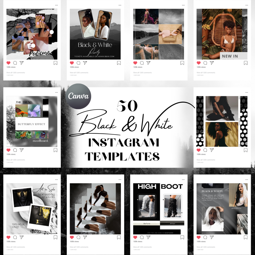 50 Black and White Instagram Templates Editable in Canva | Social Media for Fashion| E-Commerce | Business | Bloggers | Influencers