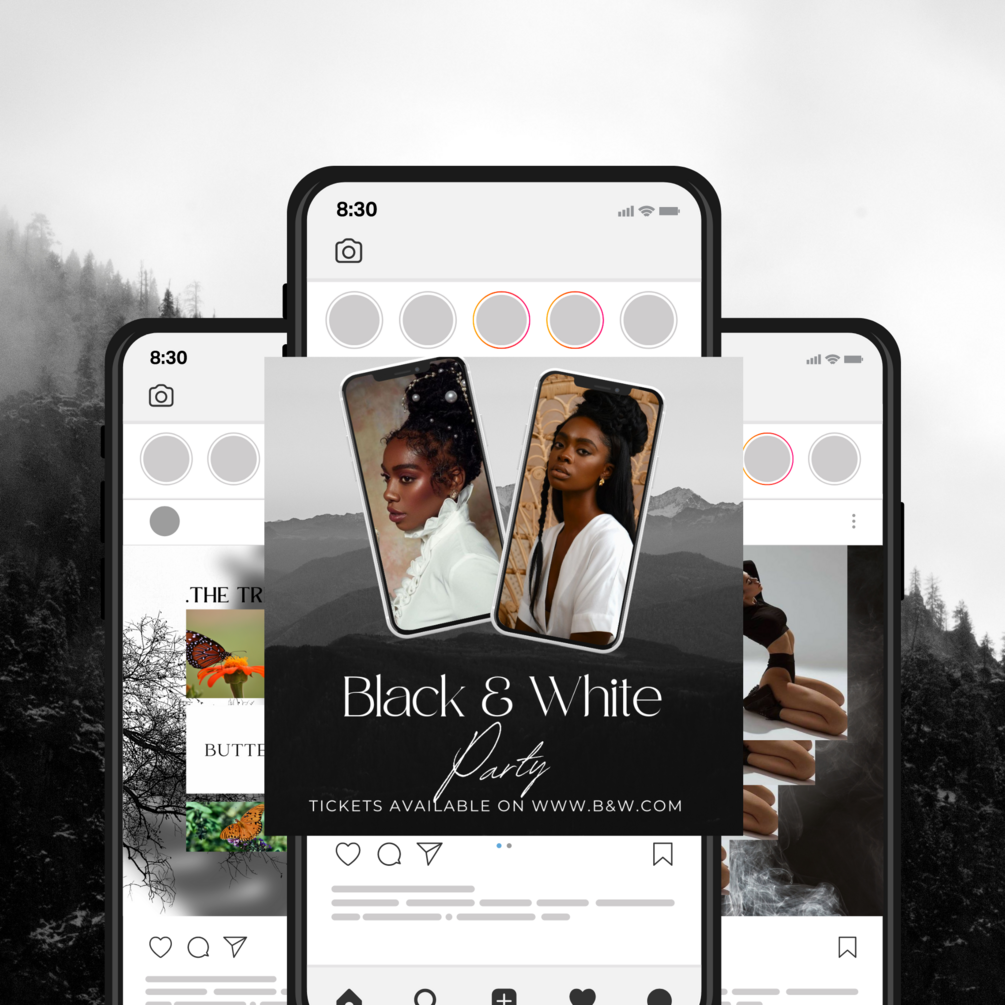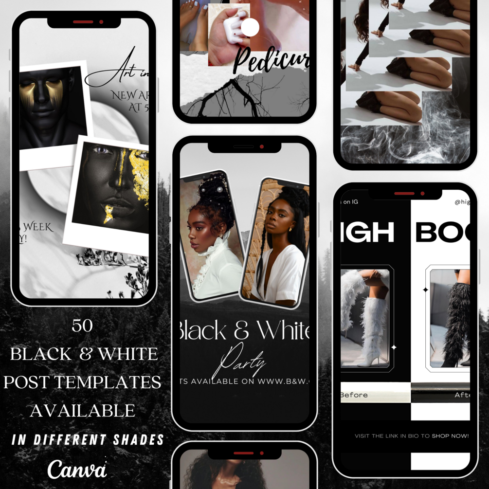 50 Black and White Instagram Templates editable in Canva, Social Media for Fashion, E-Commerce, Business, Bloggers, Influencers.