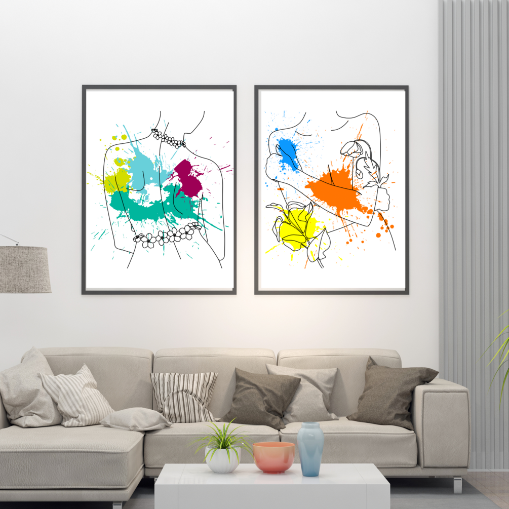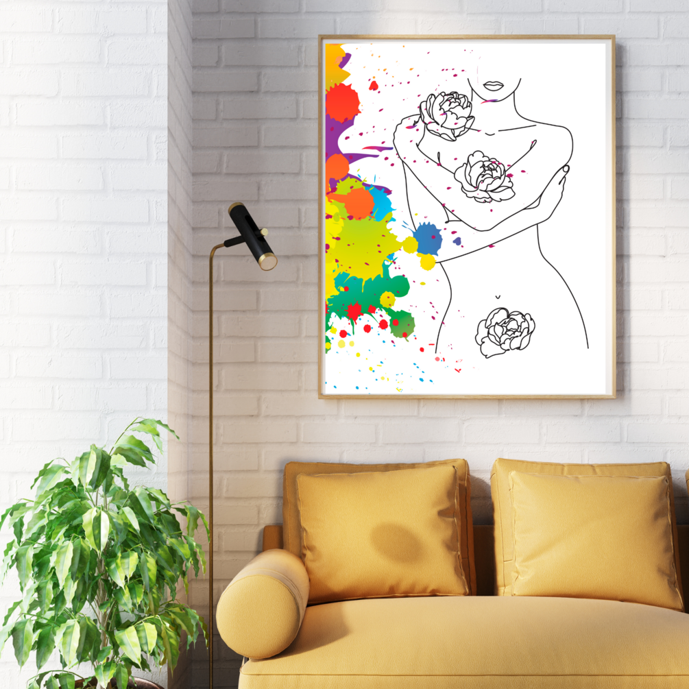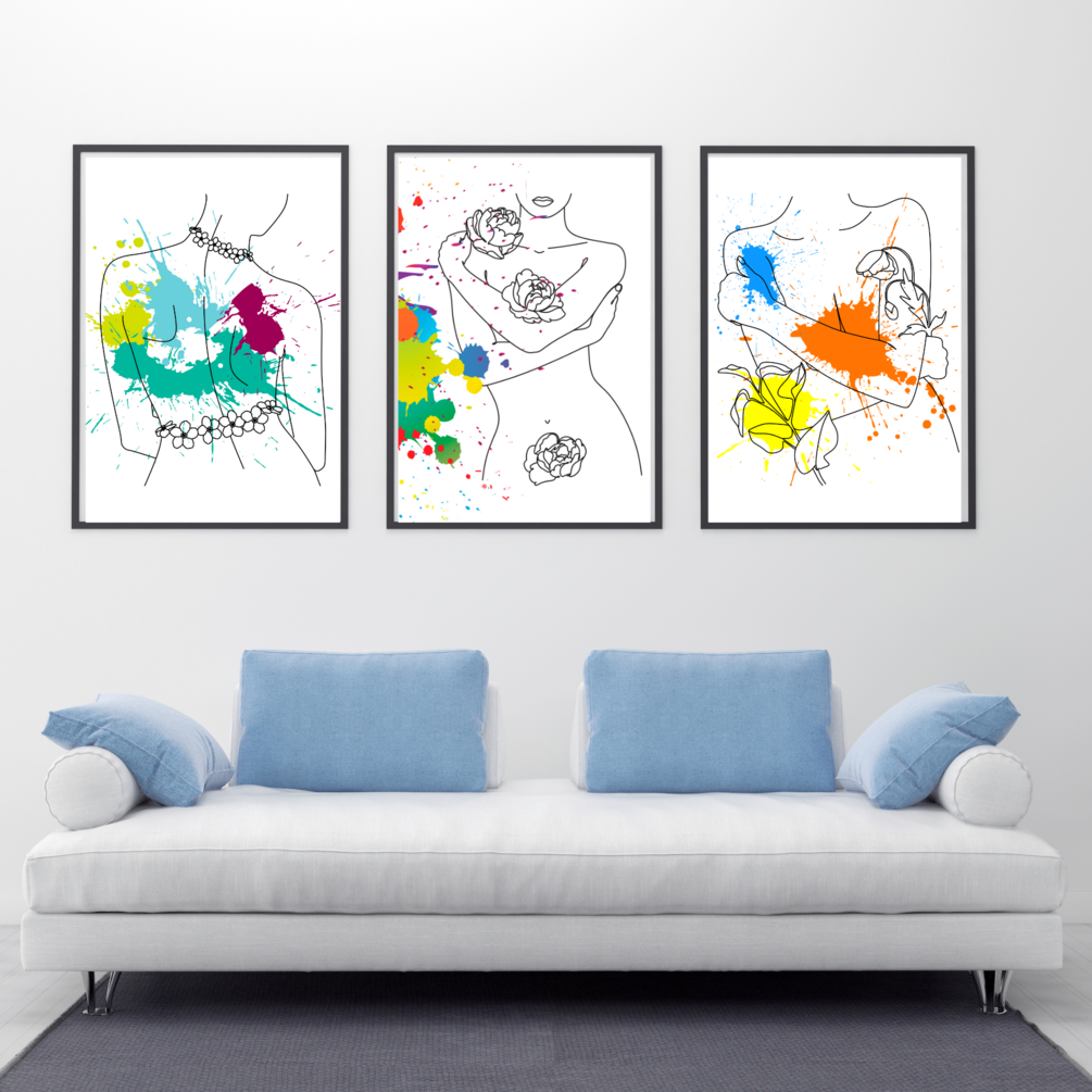 Set of 3 prints - Woman body contour outline art with Paint splash. Feminine Decor for Bedrooms and Living room.